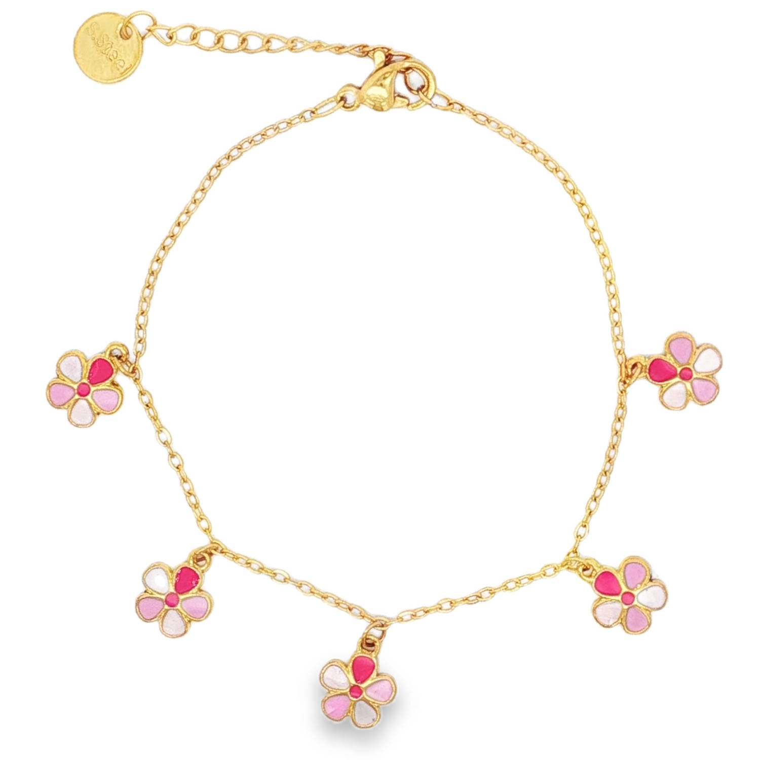 Description Sublime bracelet à charms en acier doré. Sa chaîne délicate est ornée de multiples breloques en forme de fleur émaillée de couleurs roses. Chaque élément est agencé avec une symétrie parfaite, offrant un mouvement fluide et gracieux. Une pièce d'exception idéale pour sublimer le poignet avec une sophistication discrète et luxueuse. Fermoir mousqueton avec 3 cm de rallonge.