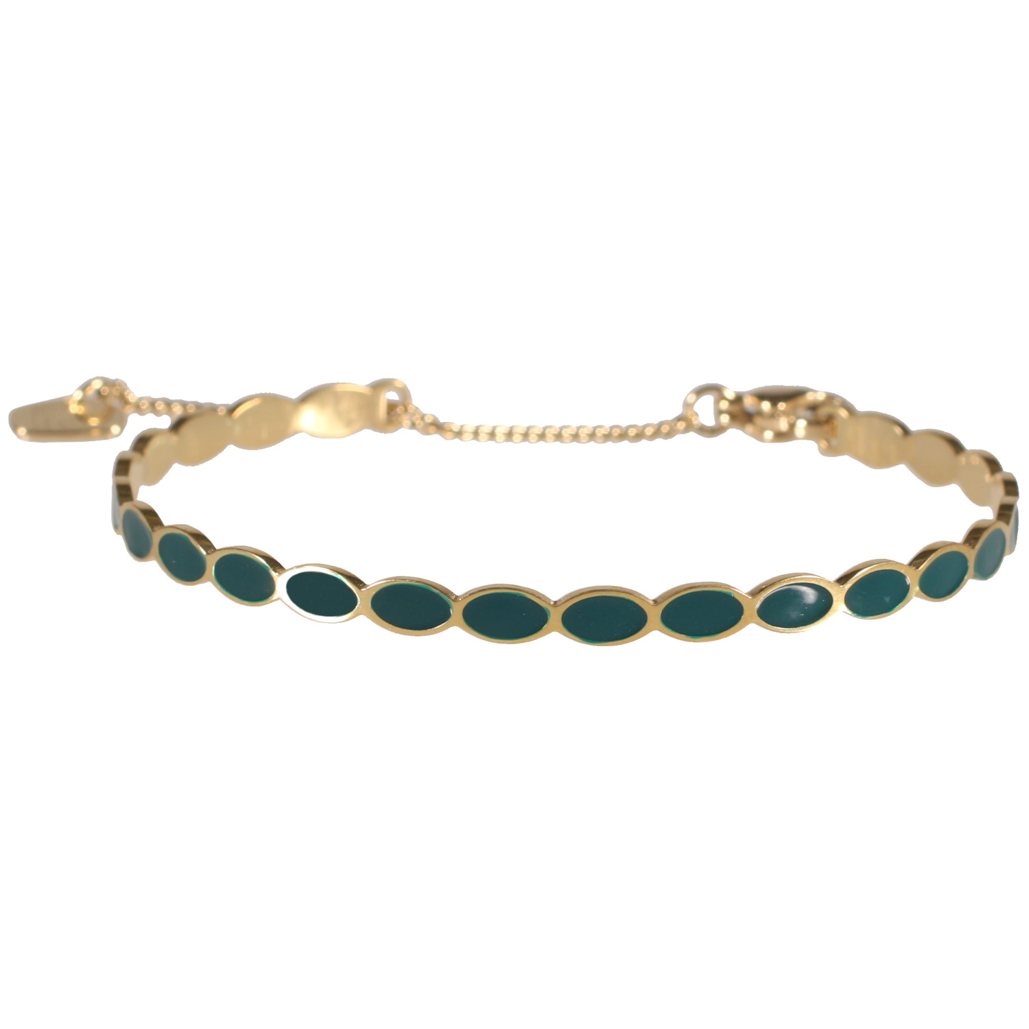 Description Bracelet jonc en acier doré plaqué d'émail de couleur verte de forme ovale. Fermoir mousqueton avec chaînette pour resserrer le jonc. Largeur 4 mm Diamètre 58 mm [Guide des tailles] Matière(s) Acier , Email . L'acier utilisé dans la bijouterie existe sous plusieurs qualités. Nous utilisons principalement la qualité 316L, qualité qui est utilisée en chirurgie. Cet acier est donc inoxydable et reste très résistant. Fermoir Mousqueton Couleur(s) dominante(s) Doré , Vert Public Adolescent , Adulte . Genre Femme , Fille . Saison Indémodable . Cliquez sur une matière, un thème, une couleur ou une collection pour voir tous les articles associés.