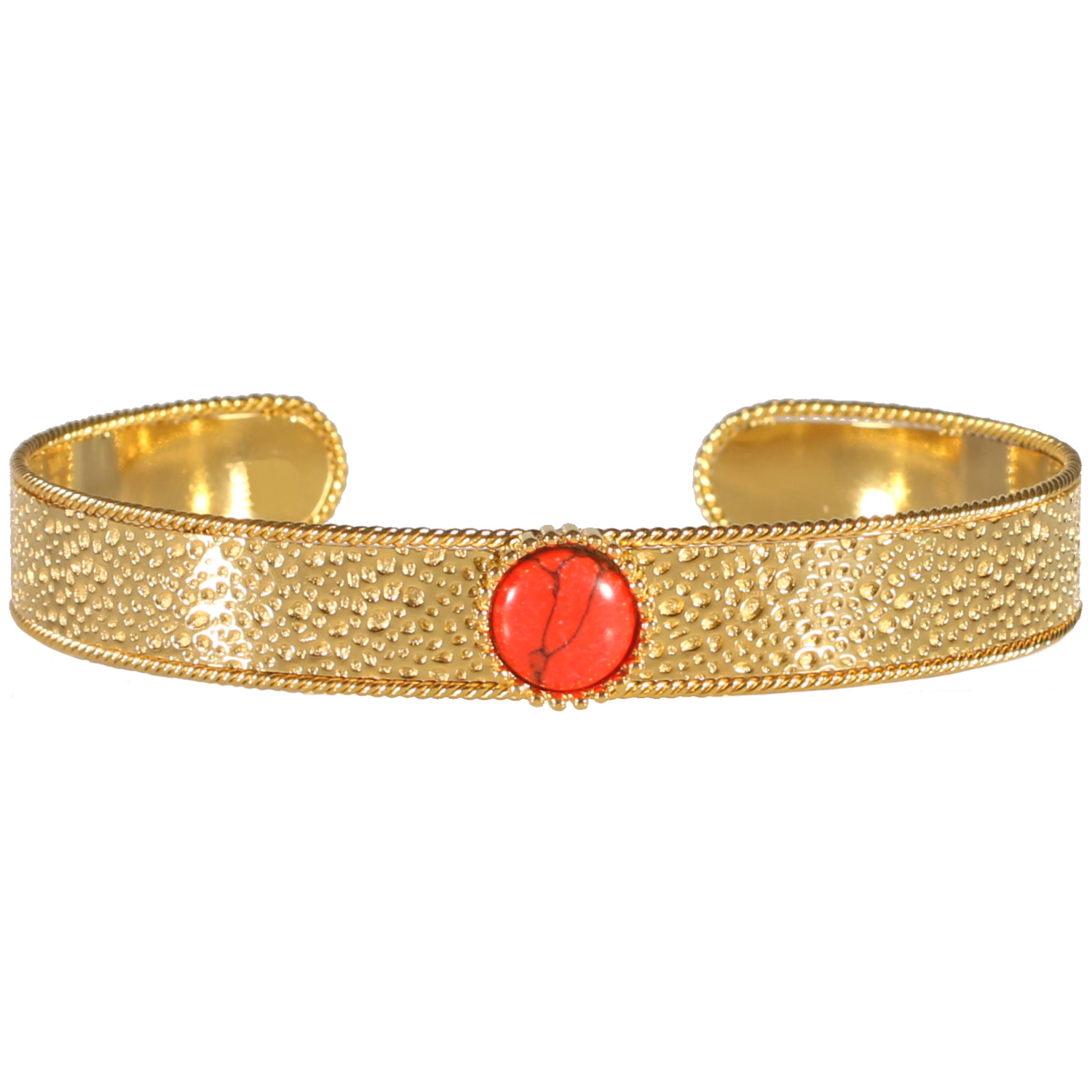 Description Bracelet jonc ouvert et rigide aux motifs martelés en acier 316L doré surmonté de d'une pierre de couleur rouge sertie clos de forme ronde. Largeur 10 mm Diamètre 58 mm [Guide des tailles] Matière(s) Acier , Rocaille . L'acier utilisé dans la bijouterie existe sous plusieurs qualités. Nous utilisons principalement la qualité 316L, qualité qui est utilisée en chirurgie. Cet acier est donc inoxydable et reste très résistant. Fermoir Aucun Couleur(s) dominante(s) Doré , Rouge Public Adolescent , Adulte . Genre Femme , Fille . Saison Indémodable . Cliquez sur une matière, un thème, une couleur ou une collection pour voir tous les articles associés.