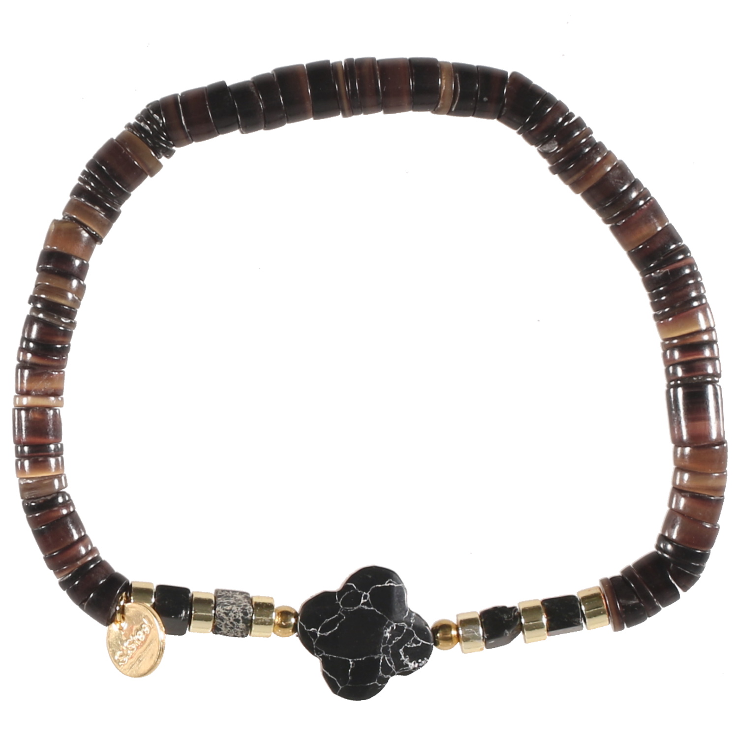 Bracelet élastique composé de perles cylindriques en acier doré, perles en pierres de couleur et une pierre de couleur en forme de trèfle à quatre feuilles.
