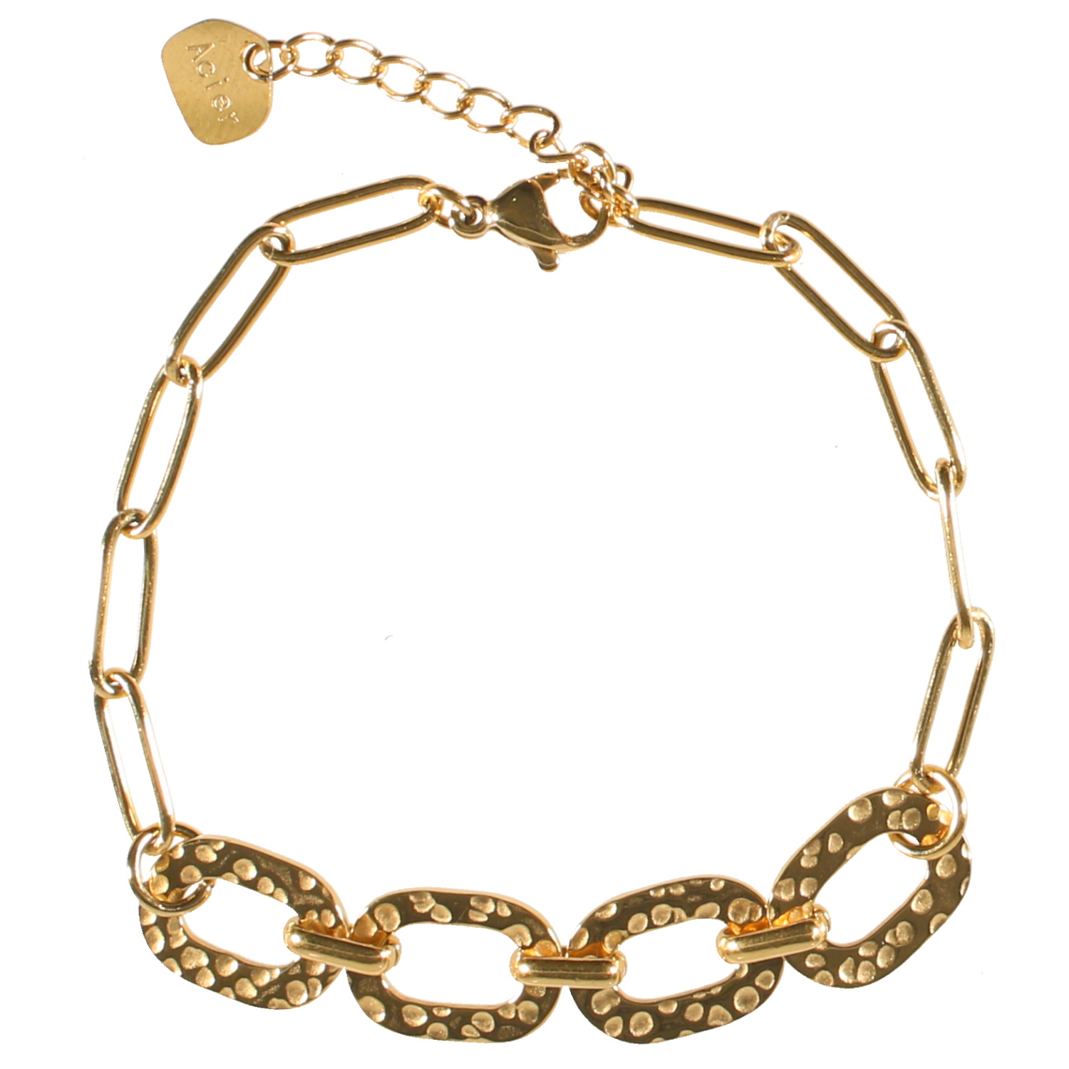 Description Bracelet composé d'une chaîne en acier doré. Fermoir mousqueton avec 2.5 cm de rallonge. Cliquez sur une matière, un thème, une couleur ou une collection pour voir tous les articles associés.