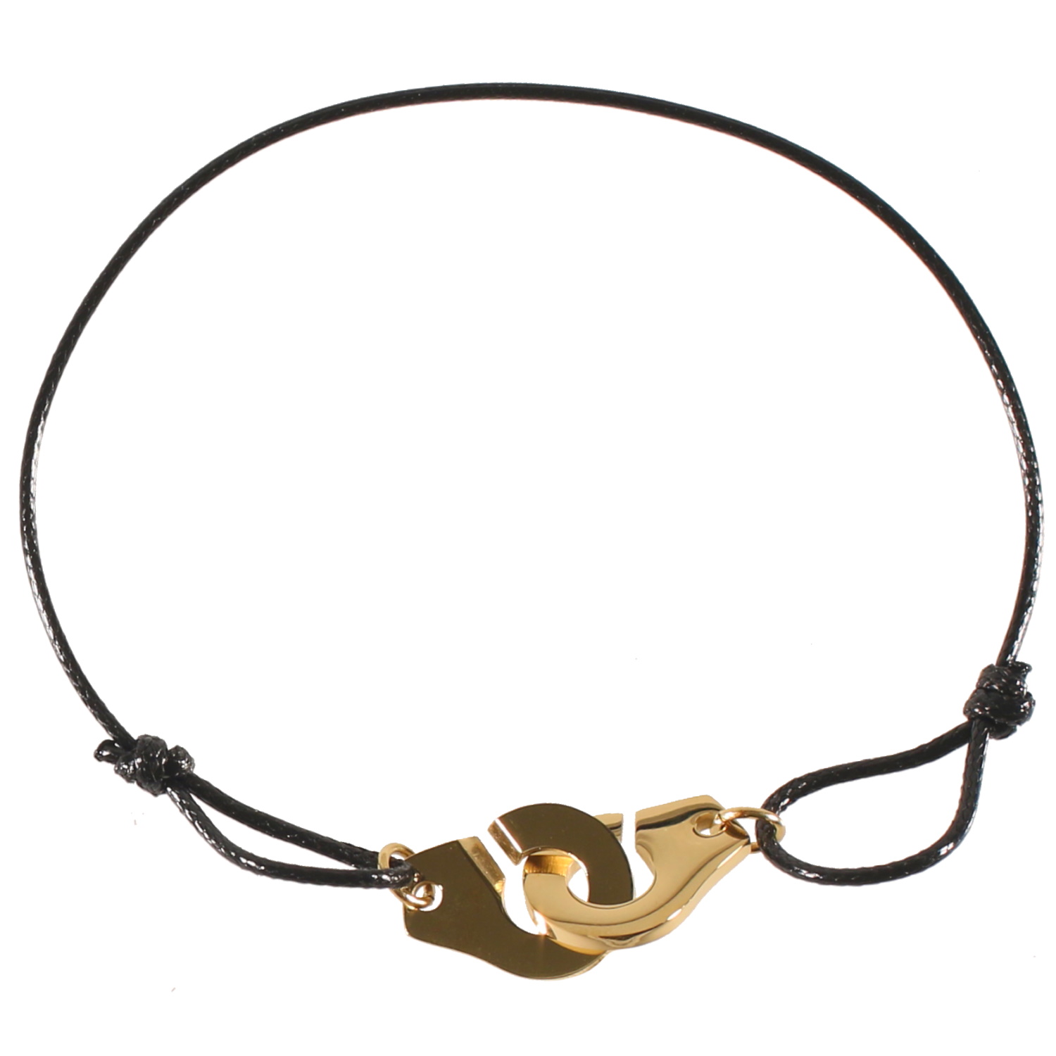 Bracelet composé d'un cordon en coton de couleur noire et des menottes en acier doré.
