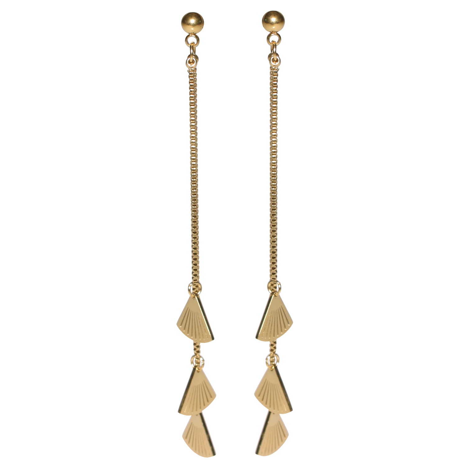 Description Boucles d'oreilles pendantes composées d'une puce ronde et de trois chaînes avec un éventail en acier doré. Largeur 10 mm Hauteur 84 mm Matière(s) Acier . L'acier utilisé dans la bijouterie existe sous plusieurs qualités. Nous utilisons principalement la qualité 316L, qualité qui est utilisée en chirurgie. Cet acier est donc inoxydable et reste très résistant. Fermoir Tiges poussettes Couleur(s) dominante(s) Doré Public Adolescent , Adulte . Genre Femme , Fille . Saison Indémodable . Cliquez sur une matière, un thème, une couleur ou une collection pour voir tous les articles associés.