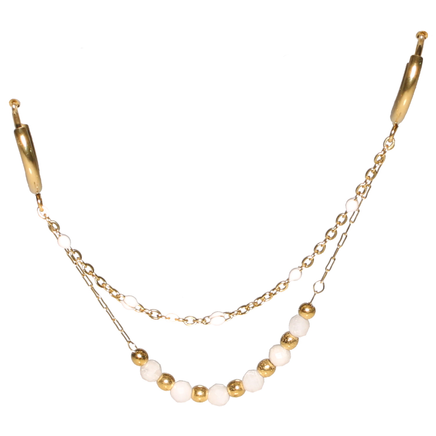 Boucle d'oreille composée d'une créole en acier doré, d'une chaîne avec perles en acier doré et perles de couleur blanche, d'une chaîne en acier doré avec perles en émail de couleur blanc et d'une créole en acier doré.