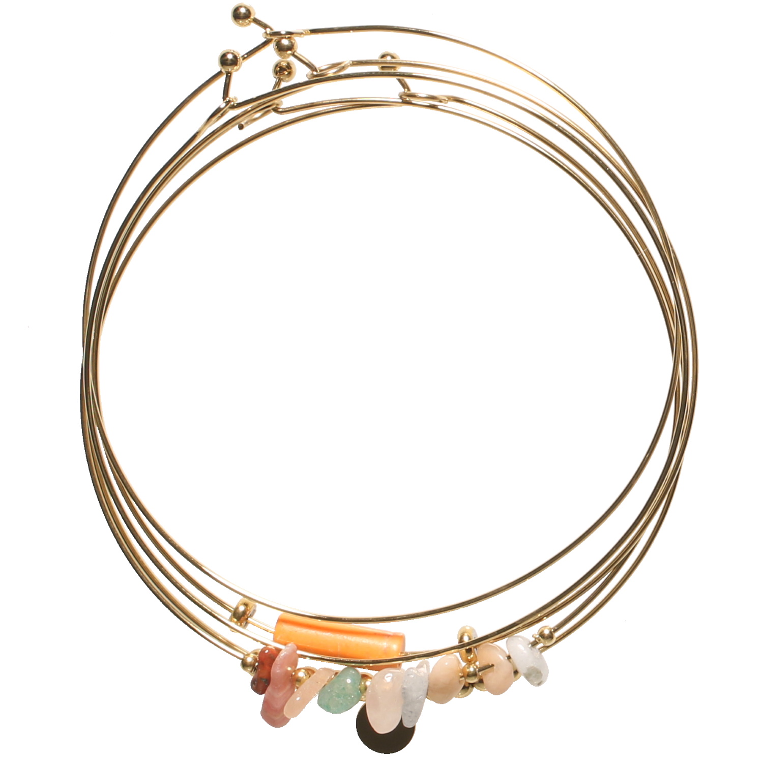 Description Lot de 5 bracelets joncs avec perles en acier doré surmontés de pierres multicolores et d'un tube en pierre de couleur orange. Cliquez sur une matière, un thème, une couleur ou une collection pour voir tous les articles associés.