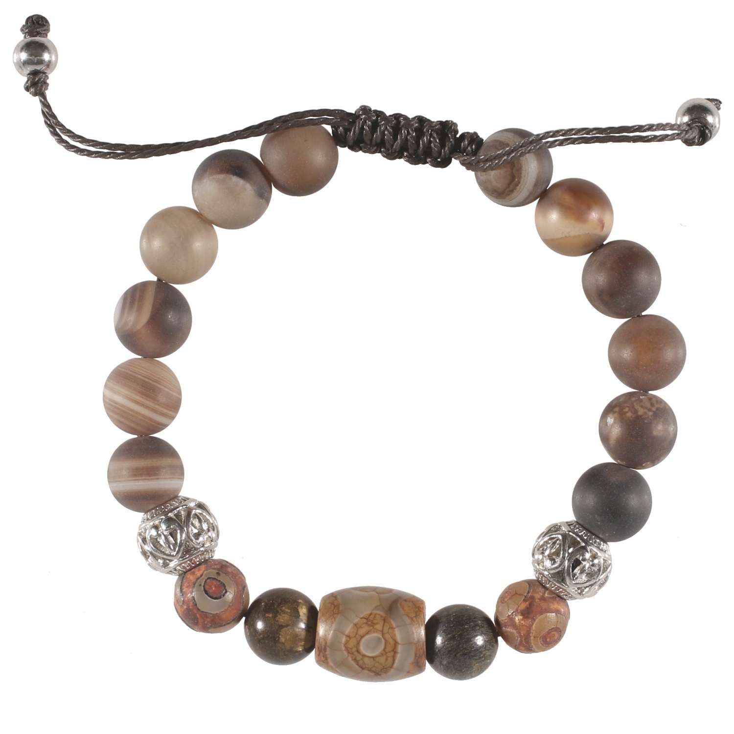 Bracelet fantaisie avec cordon en coton ciré, métal argenté et perles.