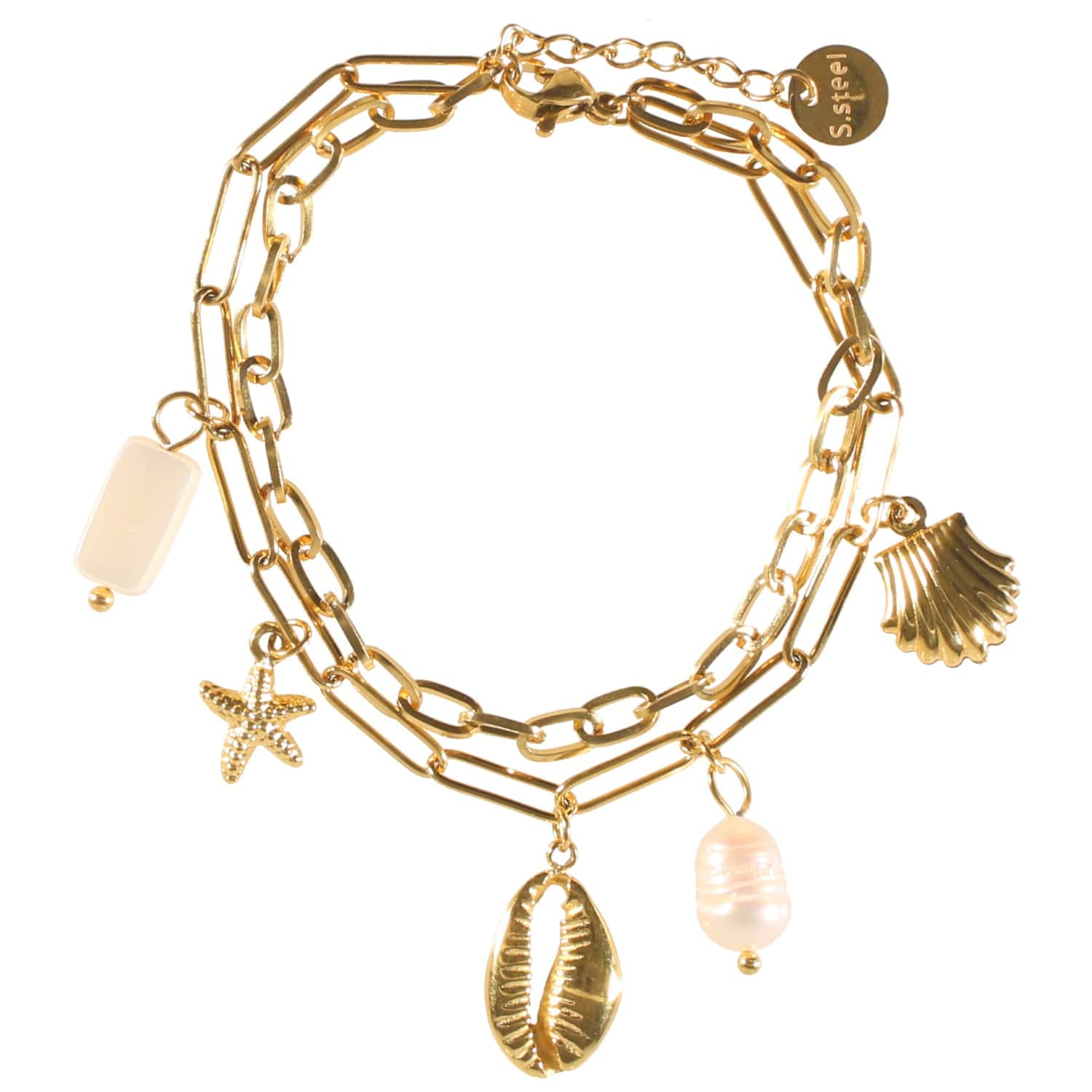 Description Bracelet double rangs avec breloques étoile de mer, coquillage et coquillage cauri en acier doré et pierres de nacre. Fermoir mousqueton avec rallonge de 2 cm. Longueur 15.5+2 cm [Guide des tailles] Largeur 5 mm Matière(s) Acier , Nacre . L'acier utilisé dans la bijouterie existe sous plusieurs qualités. Nous utilisons principalement la qualité 316L, qualité qui est utilisée en chirurgie. Cet acier est donc inoxydable et reste très résistant. Fermoir Mousqueton Couleur(s) dominante(s) Blanc , Doré Public Adolescent , Adulte . Genre Femme , Fille . Saison Eté . Collection Seaside Cliquez sur une matière, un thème, une couleur ou une collection pour voir tous les articles associés.