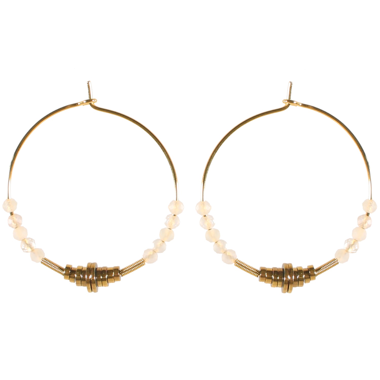 Boucles d'oreilles créoles avec rondelles en acier doré et perles en véritable pierre de lune.