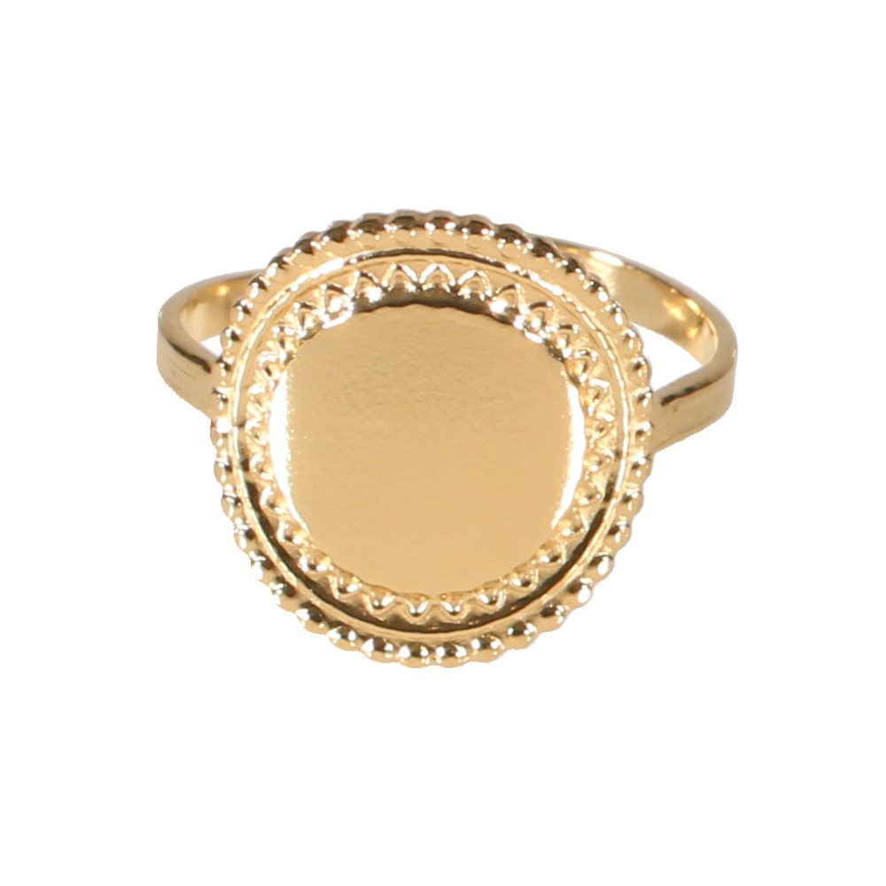 Description Bague surmontée d'une pastille ronde lisse au contour en relief en acier doré. Taille ajustable. Largeur 15 mm Matière(s) Acier . L'acier utilisé dans la bijouterie existe sous plusieurs qualités. Nous utilisons principalement la qualité 316L, qualité qui est utilisée en chirurgie. Cet acier est donc inoxydable et reste très résistant. Fermoir Aucun Couleur(s) dominante(s) Doré Public Adolescent , Adulte . Genre Femme , Fille . Saison Indémodable . Cliquez sur une matière, un thème, une couleur ou une collection pour voir tous les articles associés.