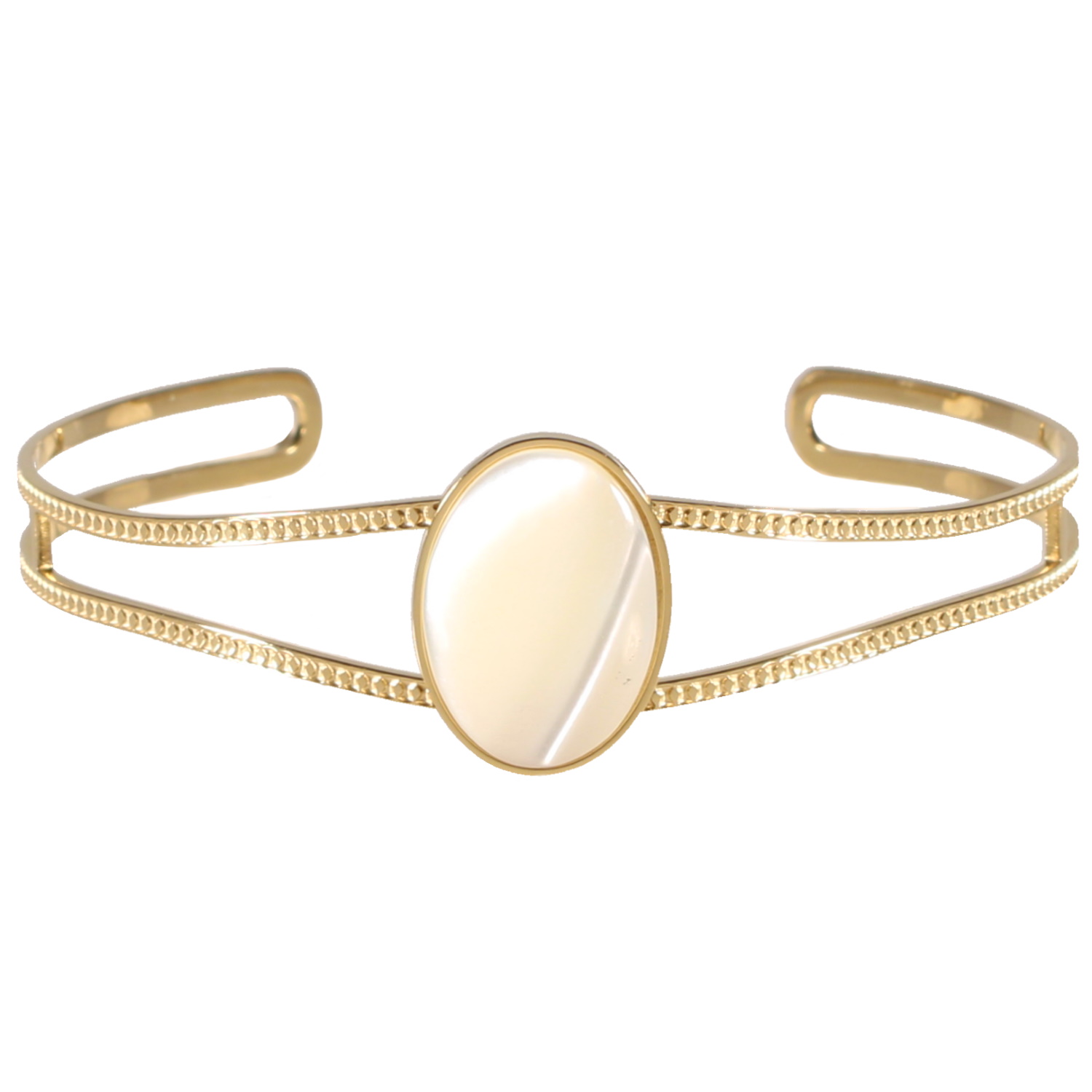 Description Bracelet jonc ouvert en acier doré surmonté d'une pastille de nacre de forme ovale sertie clos. Largeur 19 mm Diamètre 62 mm [Guide des tailles] Matière(s) Acier , Nacre . L'acier utilisé dans la bijouterie existe sous plusieurs qualités. Nous utilisons principalement la qualité 316L, qualité qui est utilisée en chirurgie. Cet acier est donc inoxydable et reste très résistant. Fermoir Aucun Couleur(s) dominante(s) Blanc , Doré Public Adolescent , Adulte . Genre Femme , Fille . Saison Indémodable . Cliquez sur une matière, un thème, une couleur ou une collection pour voir tous les articles associés.
