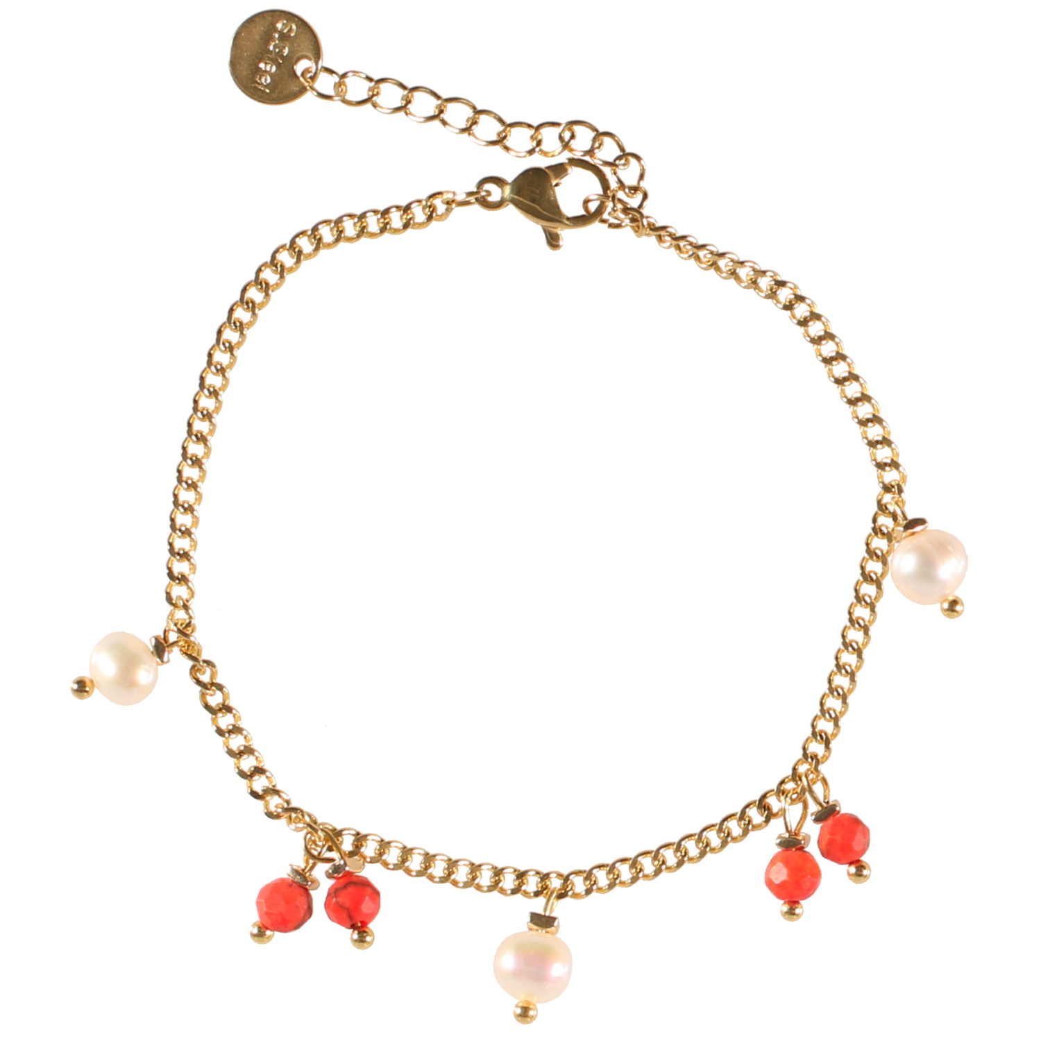 Bracelet composé d'une chaîne en acier doré et de pampilles de perles de couleur rouge et perles de nacre.
