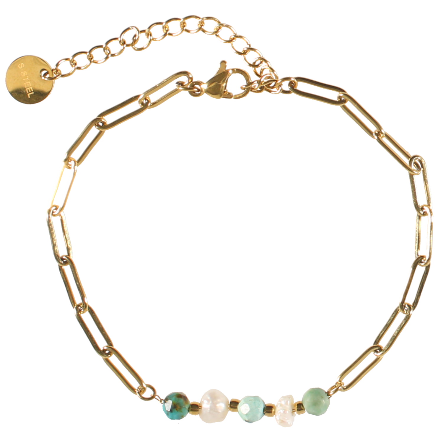 Bracelet composé d'une chaîne en acier doré, de trois perles de couleur verte et de deux perles de nacre.