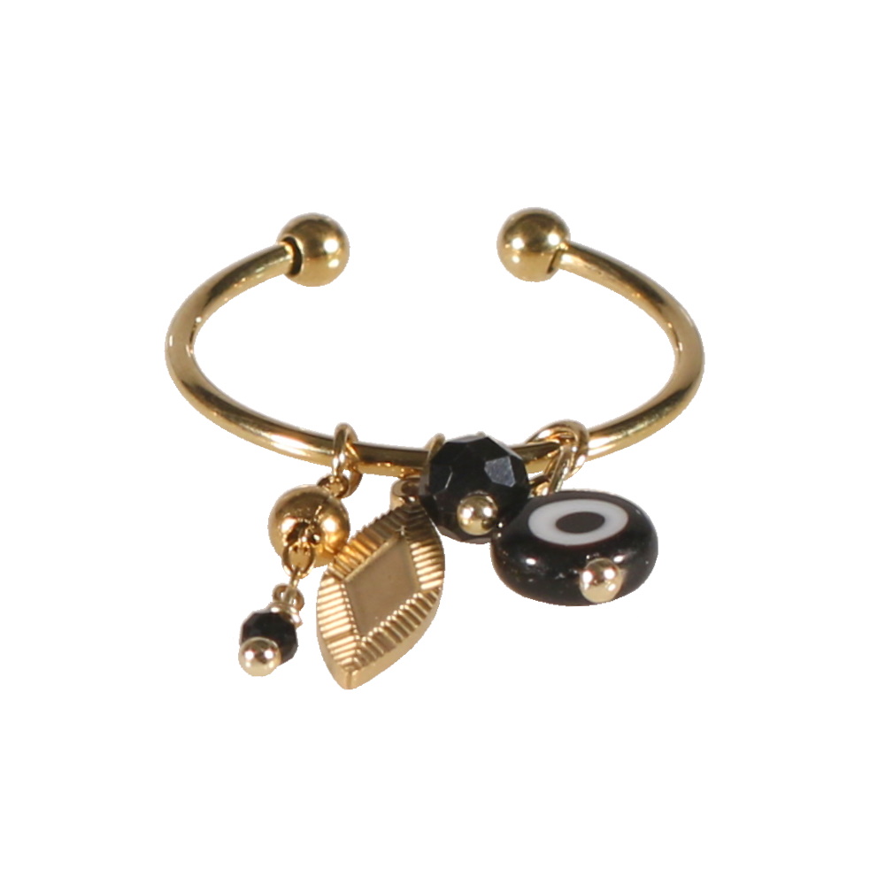 Bague en acier doré avec breloques pendants en acier doré, perles de couleur noire et un œil de Turquie de couleur noir.