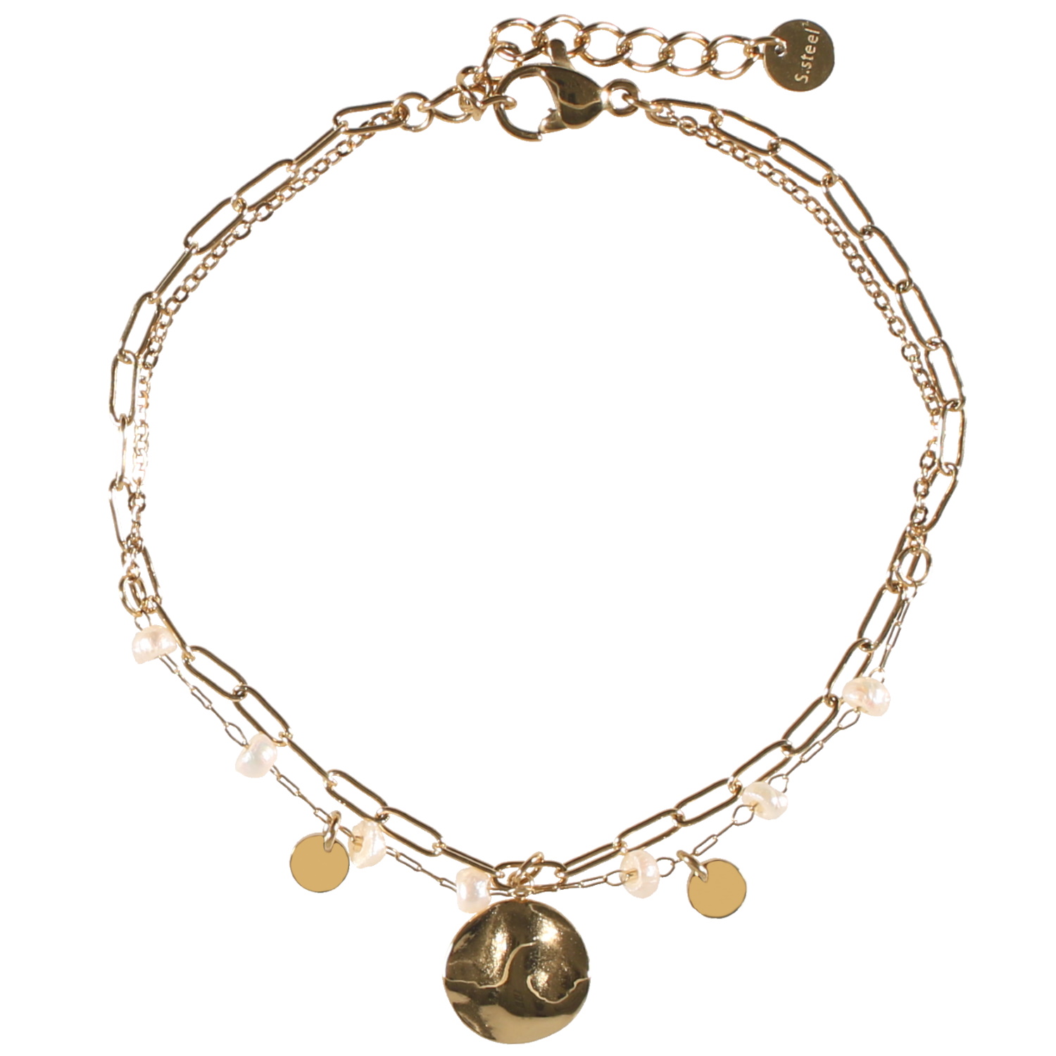 Bracelet double rangs composé d'une chaîne avec une pastille ronde martelée en acier doré, ainsi qu'une chaîne avec deux pampilles rondes en acier doré et des perles en nacre.