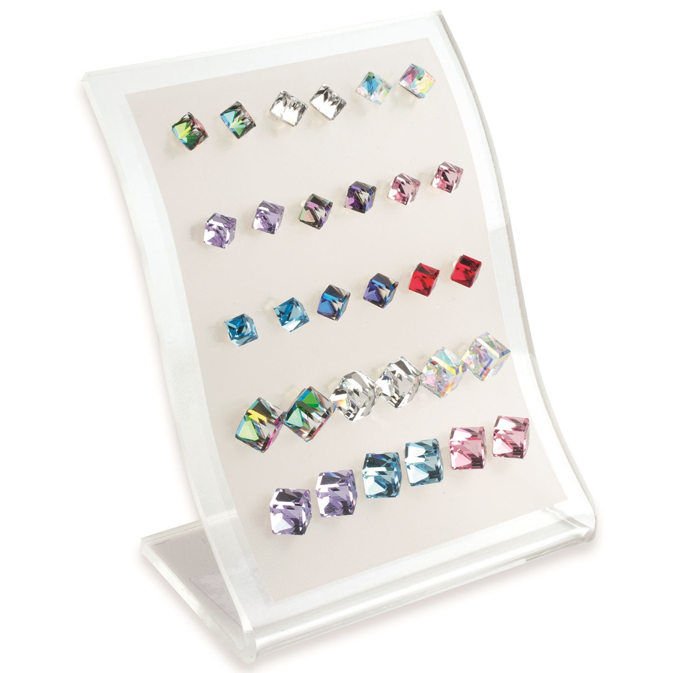 Présentoir en plexiglas comprenant 15 paires de boucles d'oreilles en argent 925/000 et cristal. Carré Lot Puce  Adulte Enfant Femme Fille Indémodable