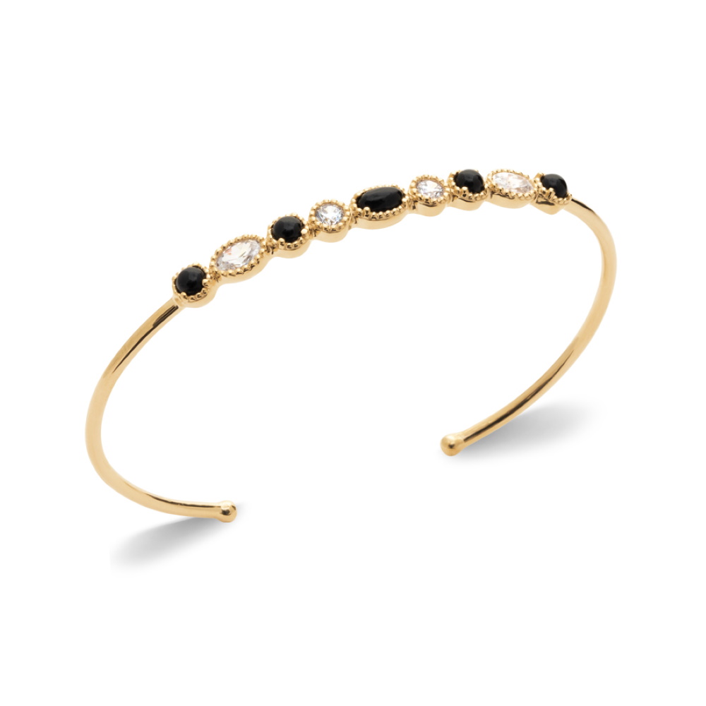 Bracelet jonc rigide ouvert en plaqué or jaune 18 carats surmonté en alternance de véritables pierres de couleur noire et d'oxydes de zirconium blancs. Jonc  Adolescent Adulte Femme Fille Indémodable