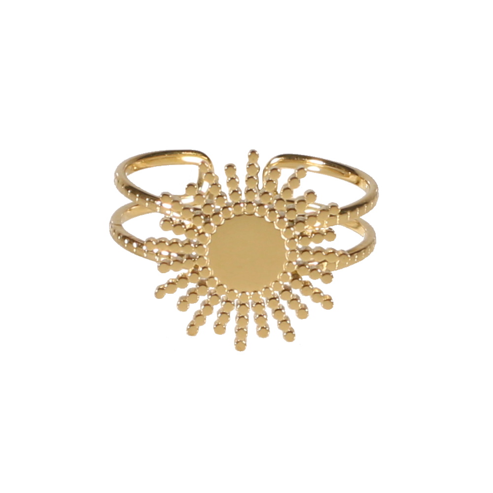 Description Bague double rangs surmontée d'un soleil en acier doré. Taille ajustable. Largeur 15 mm Matière(s) Acier . L'acier utilisé dans la bijouterie existe sous plusieurs qualités. Nous utilisons principalement la qualité 316L, qualité qui est utilisée en chirurgie. Cet acier est donc inoxydable et reste très résistant. Fermoir Aucun Couleur(s) dominante(s) Doré Public Adolescent , Adulte . Genre Femme , Fille . Saison Indémodable . Thème(s) Nature . Collection My Sun Cliquez sur une matière, un thème, une couleur ou une collection pour voir tous les articles associés.