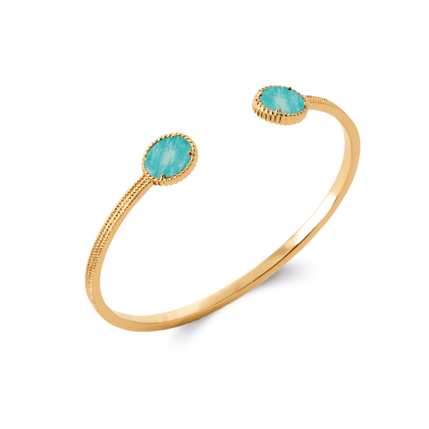 Description Bracelet jonc ouvert en plaqué or jaune 18 carats surmonté de deux véritables pierres d'amazonite sertie 4 griffes. Largeur 9 mm Diamètre 58 mm [Guide des tailles] Matière(s) Pierre naturelle , Plaqué or . Nos bijoux en plaqué or sont faits sur une base de laiton et recouverts d'or 18 carats à 3 microns sans dispersion. Cela signifie que nous garantissons 3 microns d'or sur n'importe quelle partie du bijou. Sur la plupart de nos bijoux empierrés, nous montons à 5 microns d'or 18 carats. Pour finir, nous faisons également une finition avec de l'or 24 carats afin de donner un plus bel éclat à nos bijoux. Fermoir Aucun Couleur(s) dominante(s) Bleu , Doré Public Adolescent , Adulte . Genre Femme , Fille . Saison Indémodable . Cliquez sur une matière, un thème, une couleur ou une collection pour voir tous les articles associés.