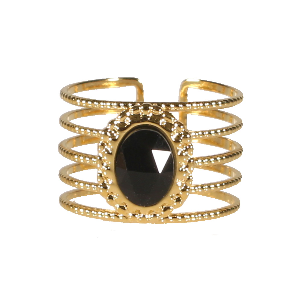 Bague cinq rangs en acier doré surmontée d'une véritable pierre d'agate sertie clos de forme ovale.<br/>Taille ajustable. Multirangs Ovale  Adolescent Adulte Femme Fille Indémodable