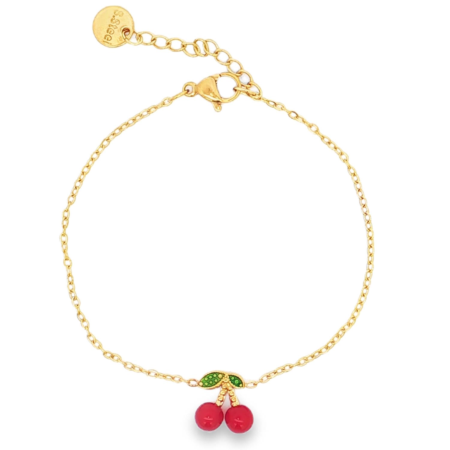 Ce bracelet chaîne délicat en acier doré offre une touche ludique avec son pendentif cerise.