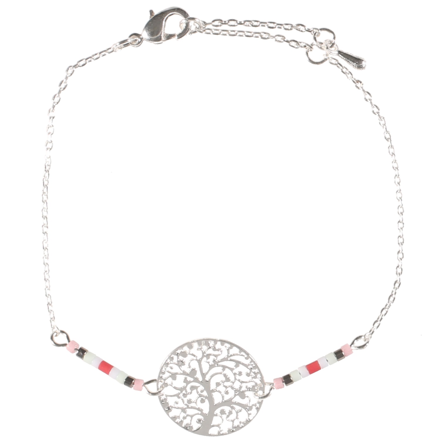 Bracelet fantaisie avec chaîne et arbre de vie en métal argenté et perles de couleur.