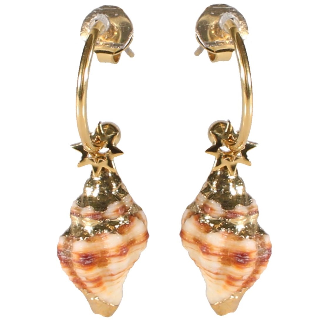 Boucles d'oreilles créoles avec étoiles en acier doré et coquillages véritables avec dorure.