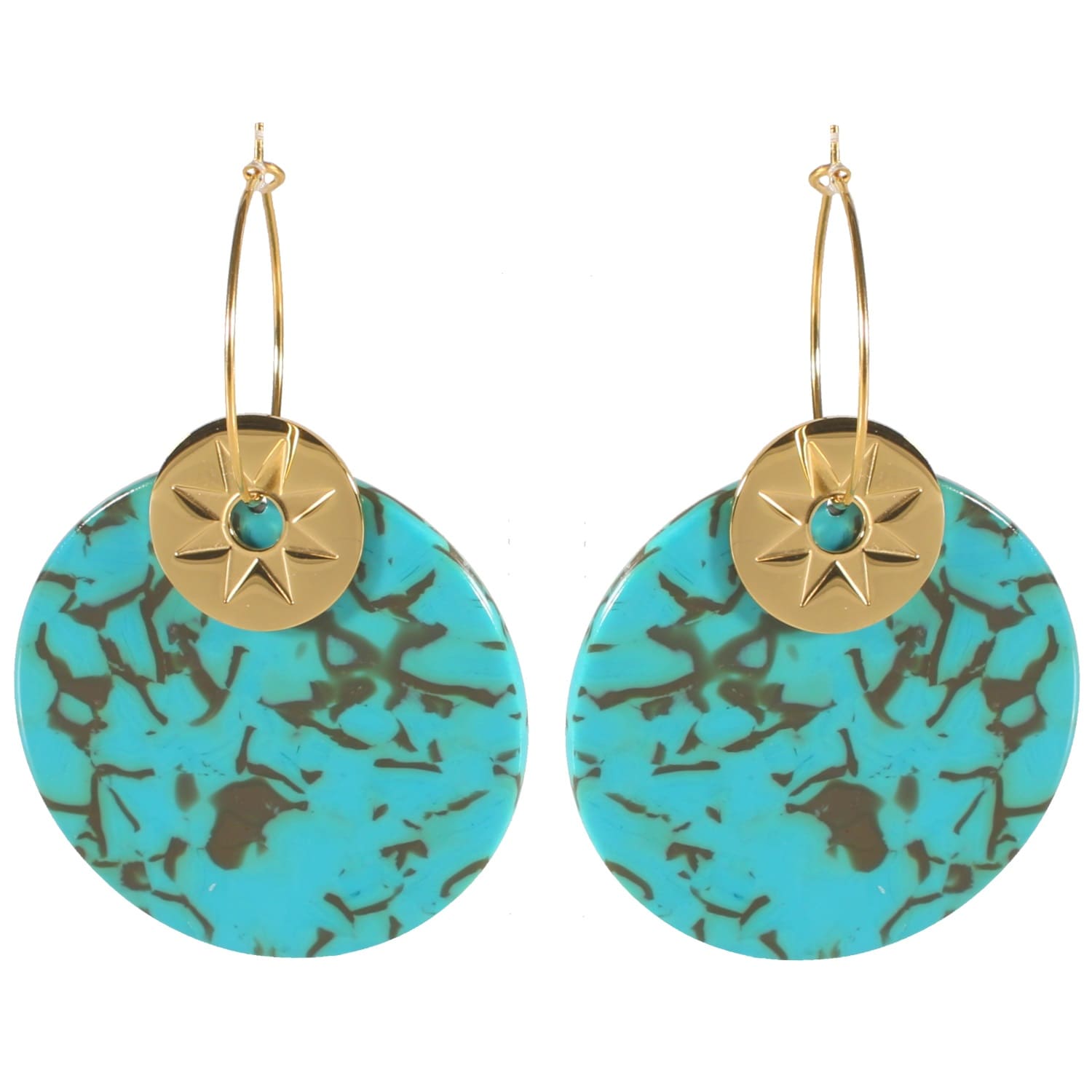 Description Boucles d'oreilles créoles avec pastilles au motif d'étoile en acier doré et pastille en matière synthétique de couleur turquoise. Largeur 38 mm Hauteur 57 mm Diamètre 20 mm Matière(s) Acier , Plastique . L'acier utilisé dans la bijouterie existe sous plusieurs qualités. Nous utilisons principalement la qualité 316L, qualité qui est utilisée en chirurgie. Cet acier est donc inoxydable et reste très résistant. Fermoir Autre Couleur(s) dominante(s) Bleu , Doré Public Adolescent , Adulte . Genre Femme , Fille . Saison Indémodable . Thème(s) Nature . Cliquez sur une matière, un thème, une couleur ou une collection pour voir tous les articles associés.