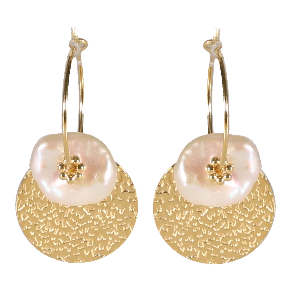Boucles d'oreilles créoles avec pastille ronde martelée en acier doré surmontée d'une nacre.