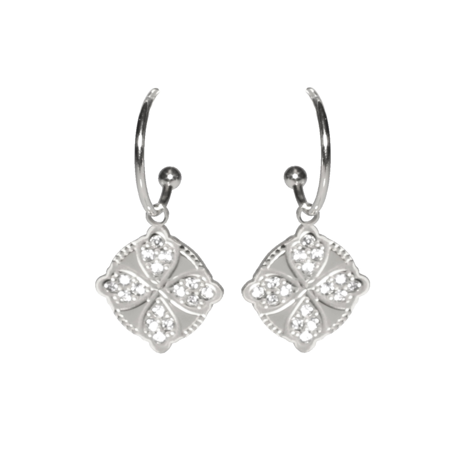 Boucles d'oreilles créoles ouvertes en acier argenté avec un pendant rond surmonté d'un trèfle à quatre feuilles pavé de strass.