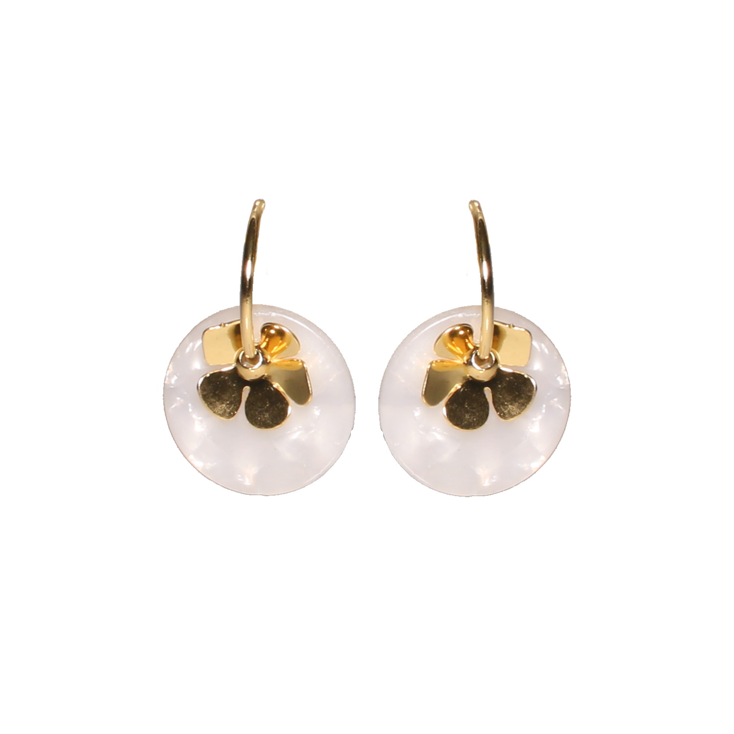 Boucles d'oreilles créoles ouvertes surmontées d'une fleur en acier doré et d'une pastille ronde de couleur blanche.