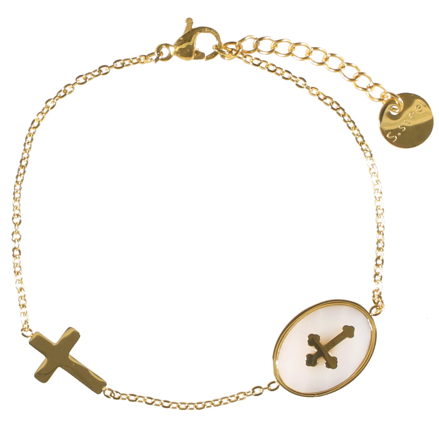 Bracelet avec croix en acier doré et croix sur pierre de couleur.