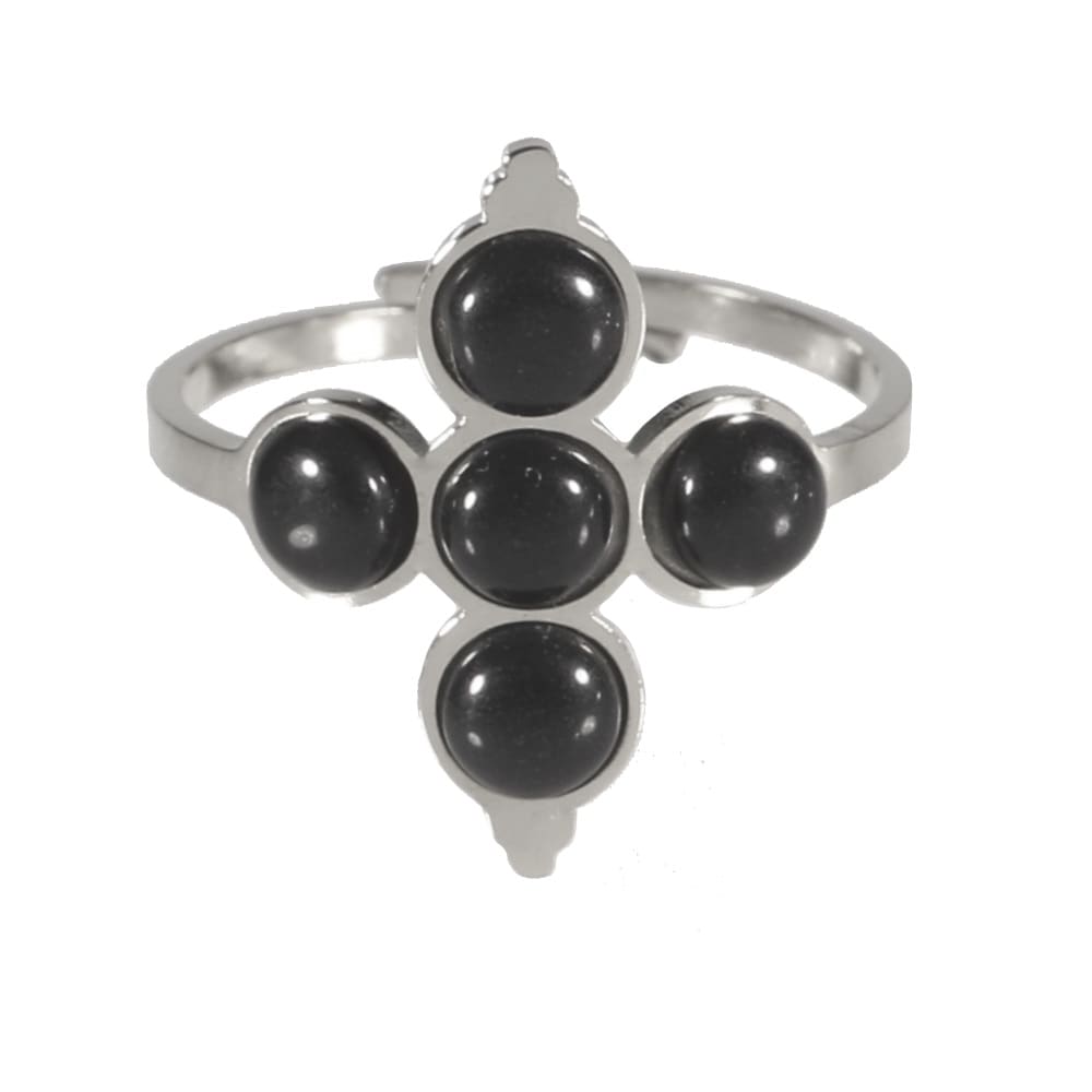 Bague croix en acier argenté et 4 pierres de couleur noire.