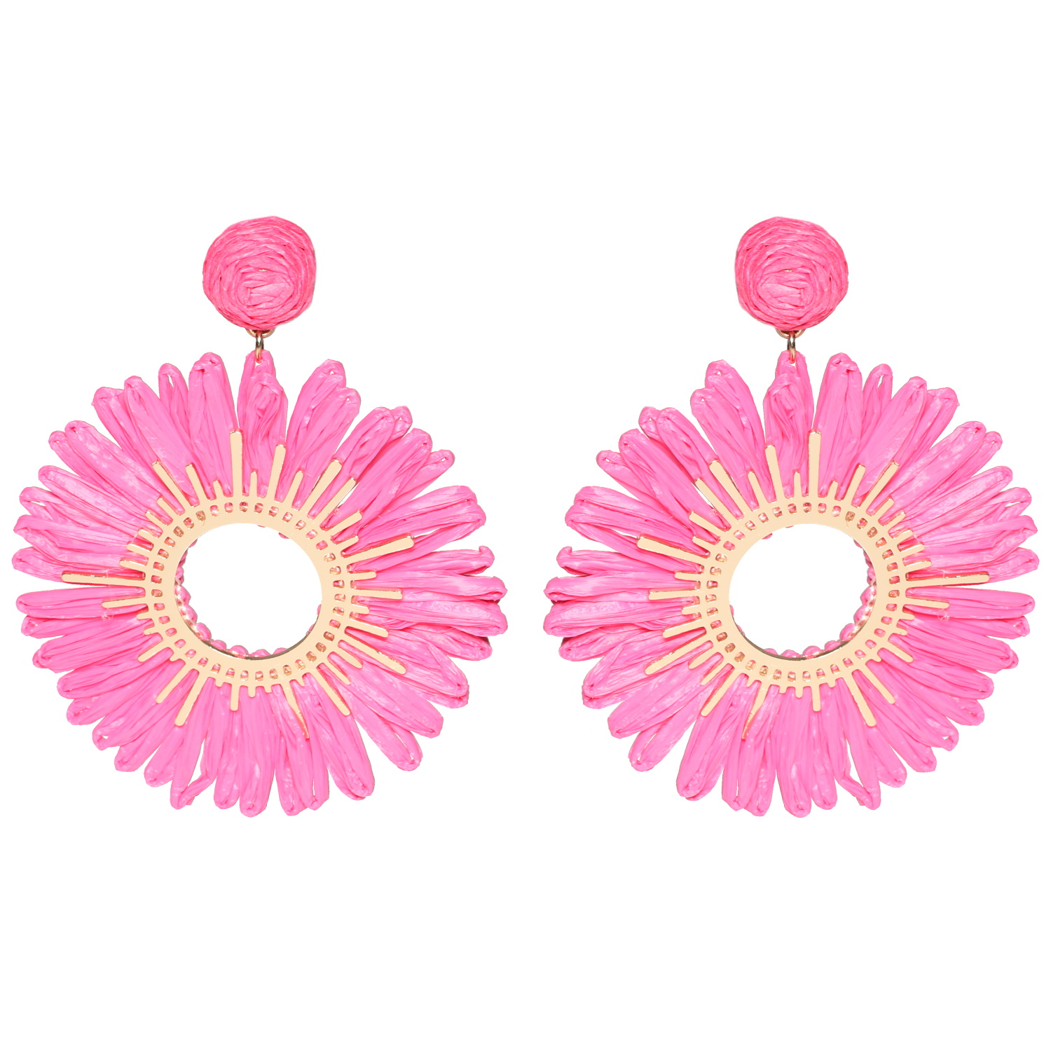 Boucles d'oreilles fantaisies pendantes en forme de fleur marguerite en acier doré et paille artificielle de couleur rose fuchsia.