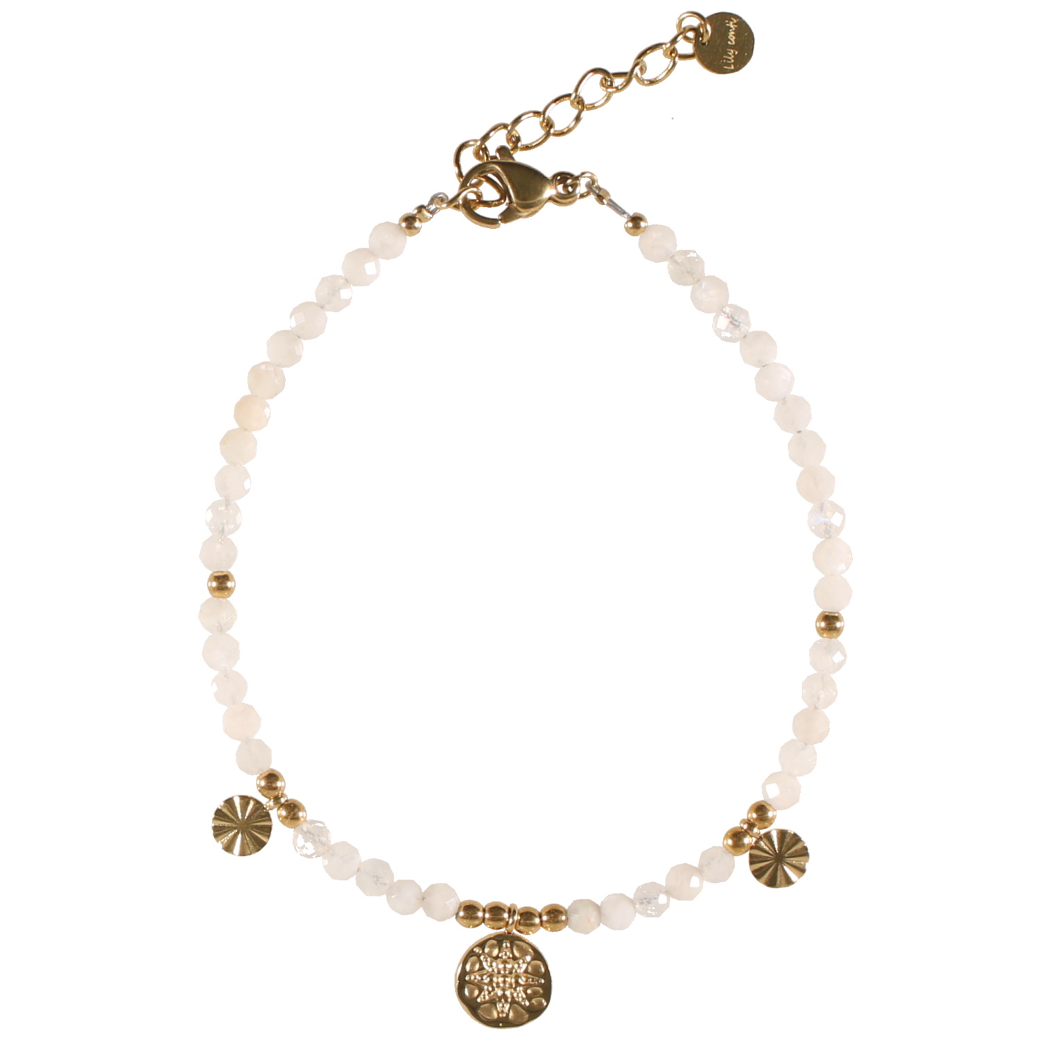 Bracelet composé de perles en véritable pierre de lune, de perles et pastilles rondes en acier doré.