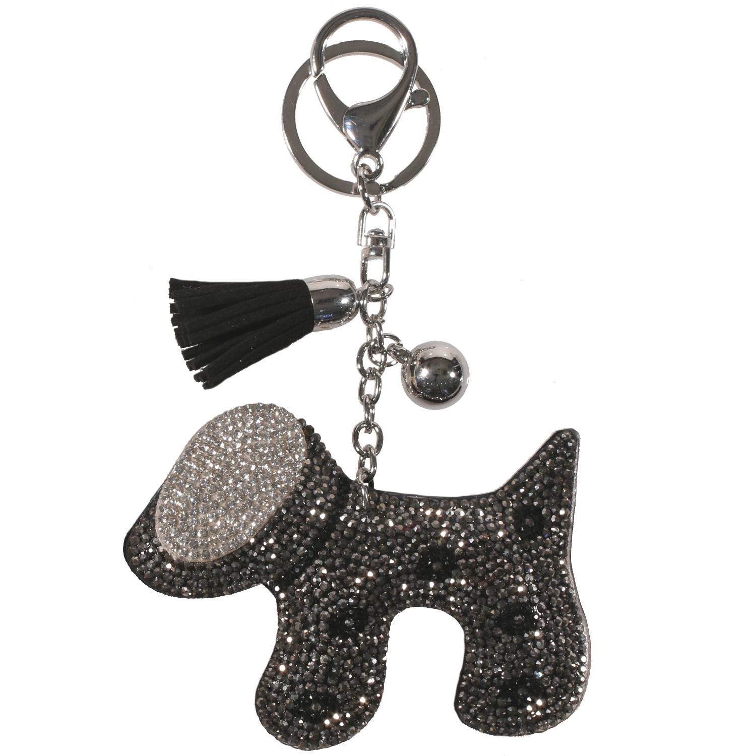 Porte-clés fantaisie en métal argenté, textile, suédine et cristaux synthétiques.