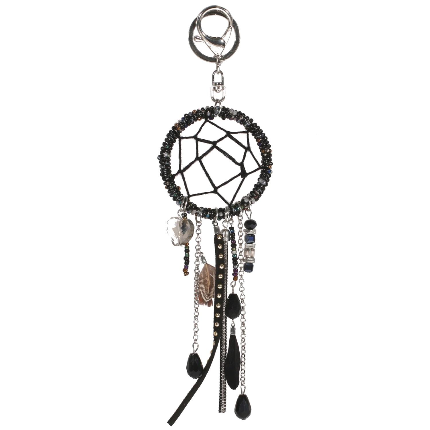 Porte-clés en métal argenté, métal peint, rocaille, suédine, textile et plume.