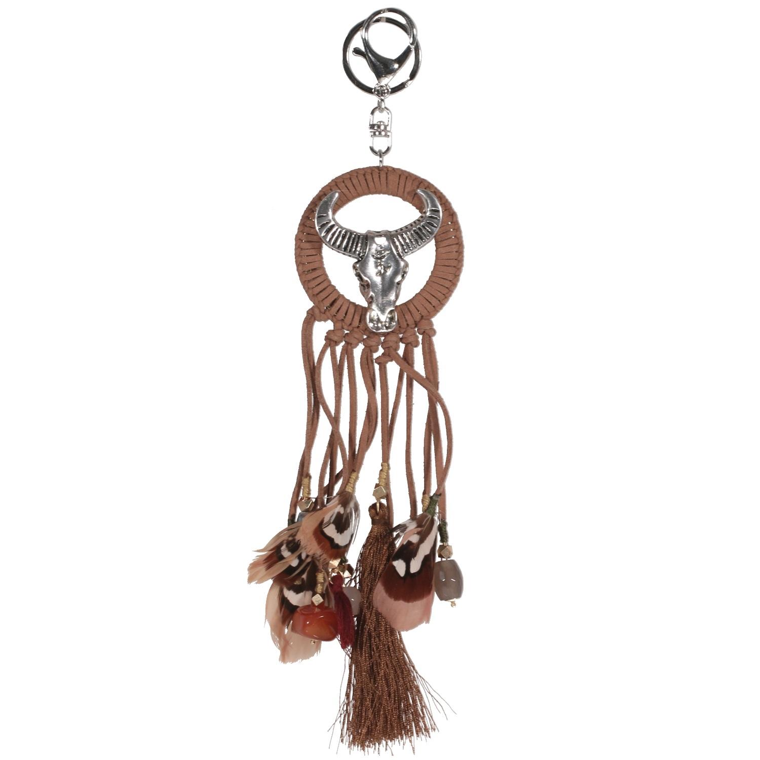 Porte-clés fantaisie en métal argenté, métal doré, rocaille, suédine, textile et plume.
