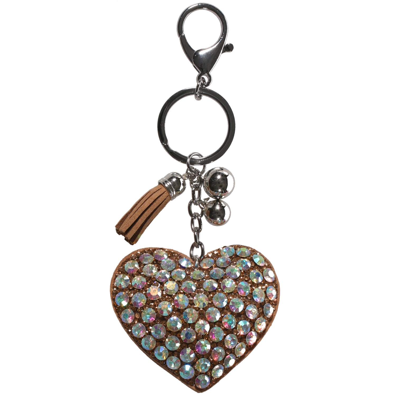 Porte-clés fantaisie en métal argenté, suédine et cristaux synthétiques.