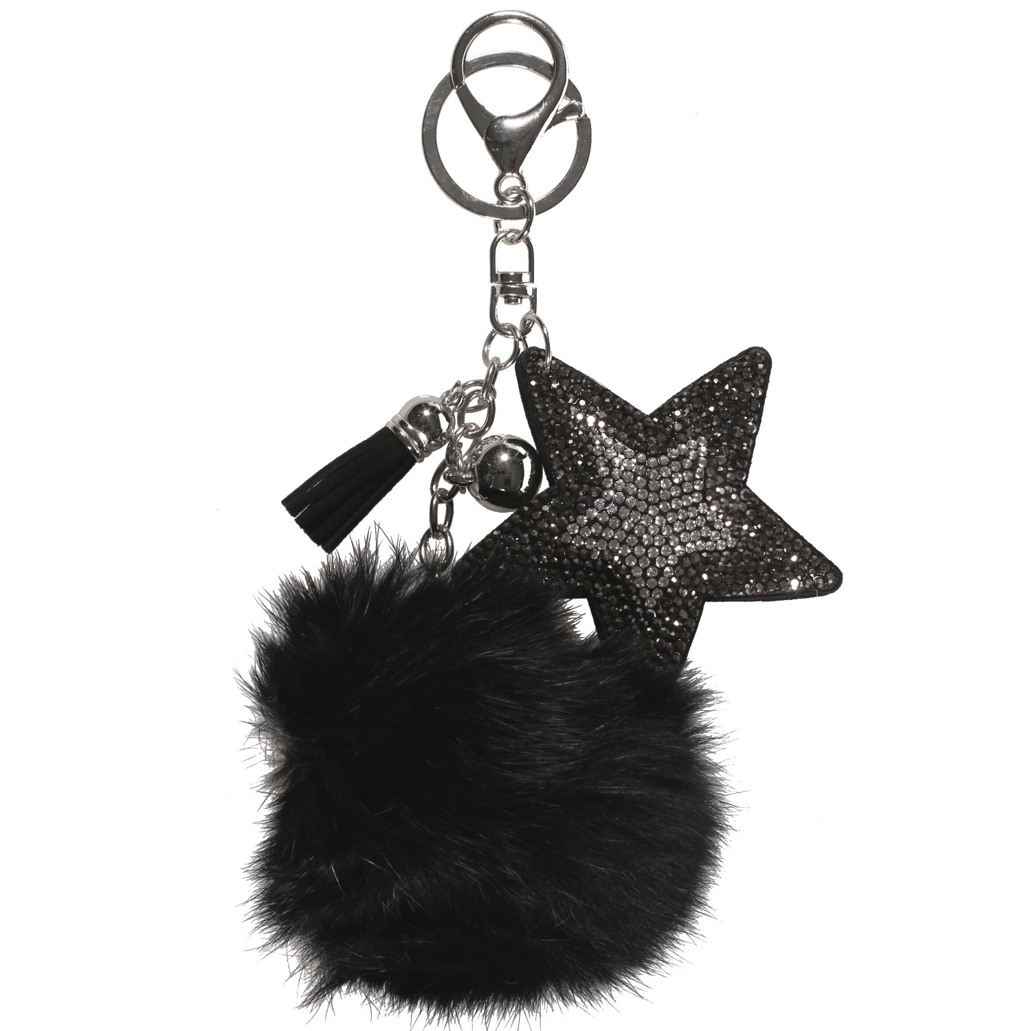 Porte-clés en métal argenté, suédine, textile et cristaux synthétiques.