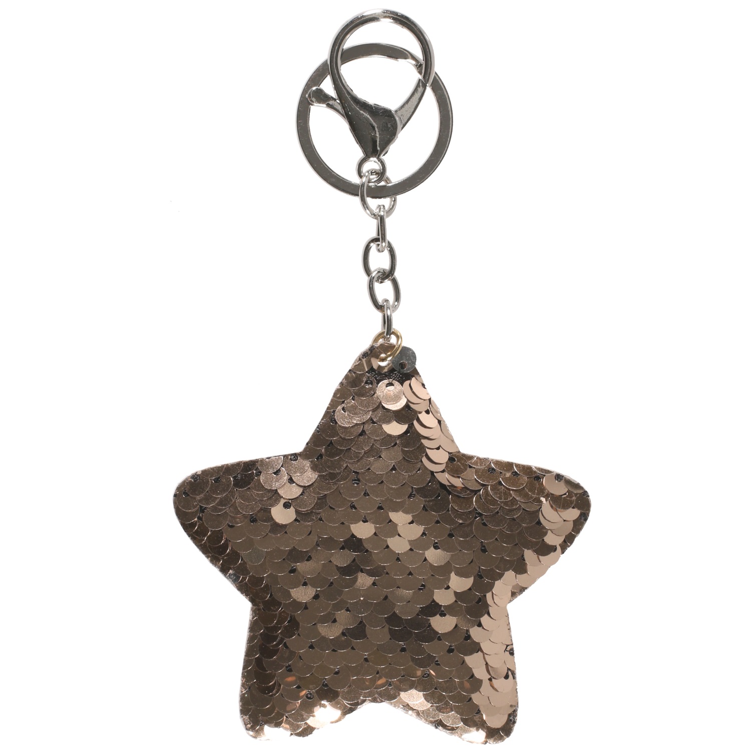 Porte-clés fantaisie en forme d'étoile en métal argenté, textile et écailles rondes effet facette en plastique.