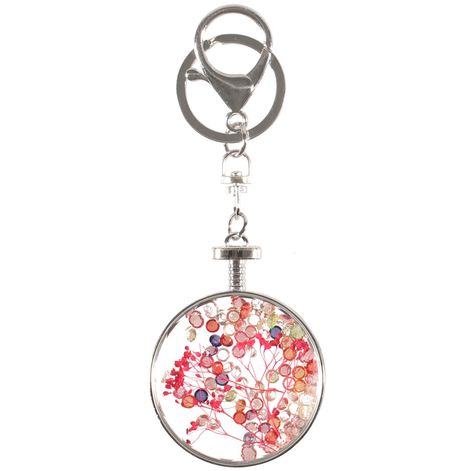 Porte-clés fantaisie en méta argenté et rond de verre avec à l'intérieur une fleur et cristaux de couleur.
