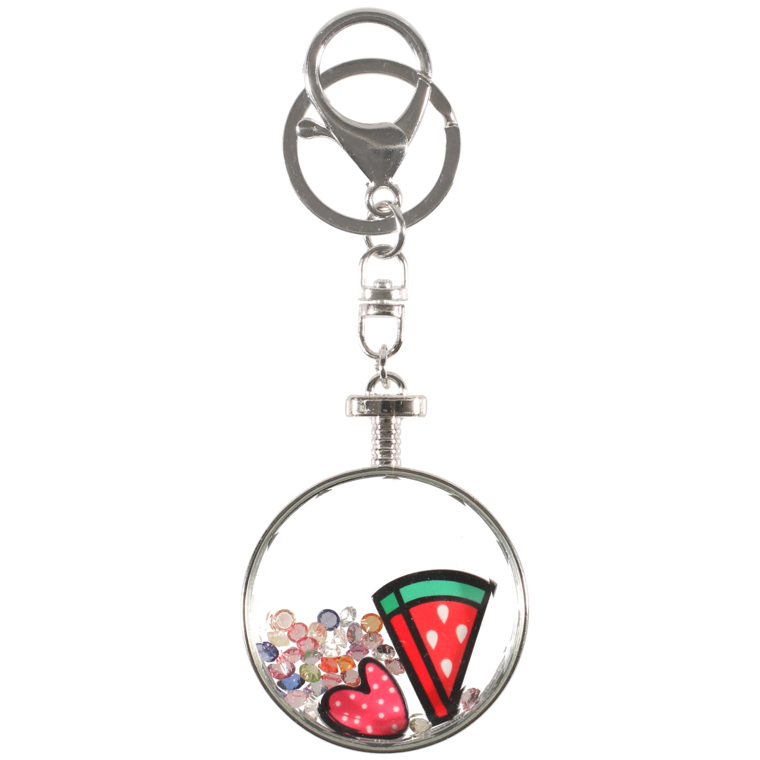 Porte-clés fantaisie en méta argenté et rond de verre avec à l'intérieur cœur et pastèque en plastique et cristaux de couleur.