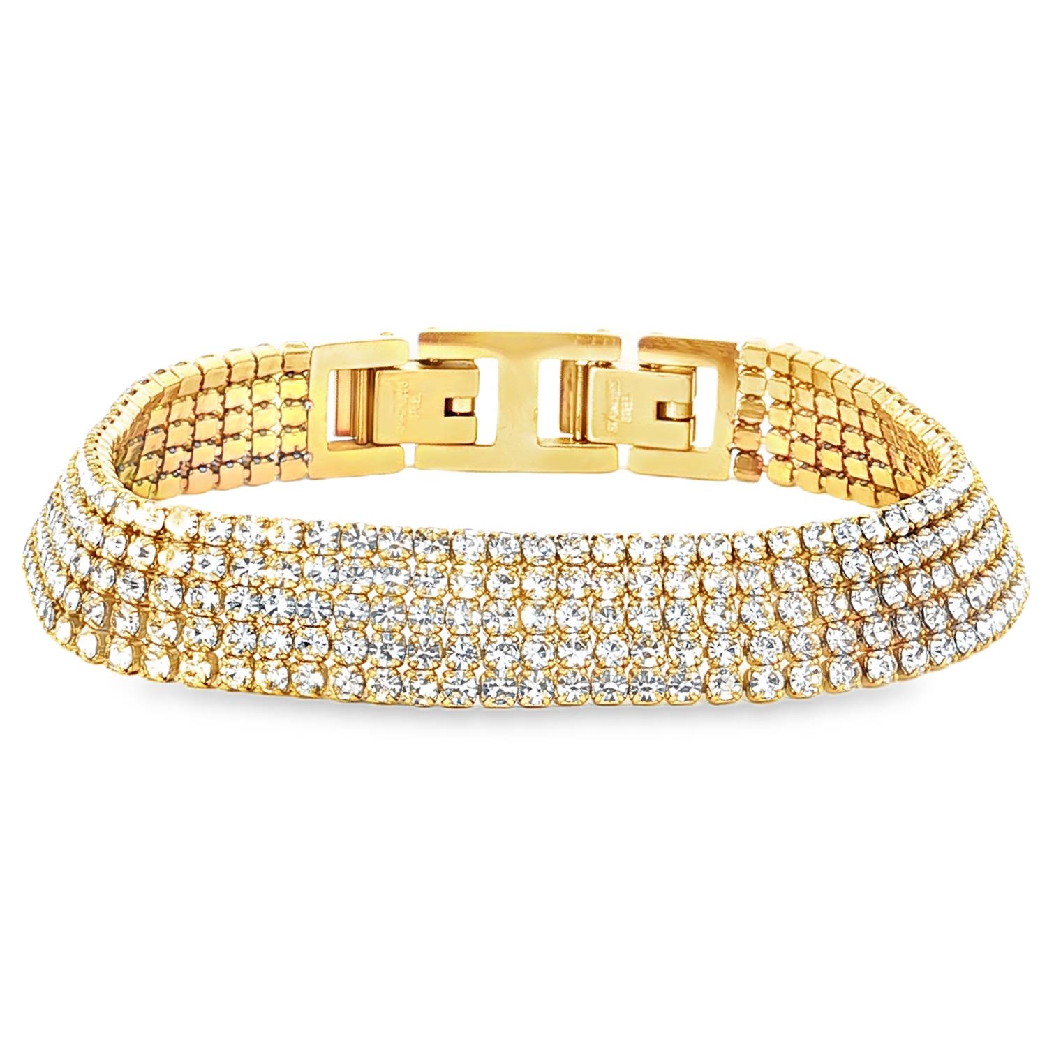 Description Ce bracelet sophistiqué se distingue par son design audacieux et lumineux. Conçu pour capturer la lumière sous tous les angles, il apporte une touche de glamour immédiate à n'importe quelle tenue, qu'elle soit de soirée ou plus décontractée-chic. Le bracelet se compose de cinq rangées parallèles de cristaux blancs scintillants, créant un effet manchette luxueux et structuré. Il est doté d'un fermoir à cliquet robuste, assurant une tenue parfaite au poignet tout en restant facile à manipuler. Longueur 17 cm [Guide des tailles] Largeur 11 mm Matière(s) Acier , Verre . L'acier utilisé dans la bijouterie existe sous plusieurs qualités. Nous utilisons principalement la qualité 316L, qualité qui est utilisée en chirurgie. Cet acier est donc inoxydable et reste très résistant. Fermoir Cliquet Couleur(s) dominante(s) Doré Public Adolescent , Adulte . Genre Femme , Fille . Saison Indémodable . Cliquez sur une matière, un thème, une couleur ou une collection pour voir tous les articles associés.