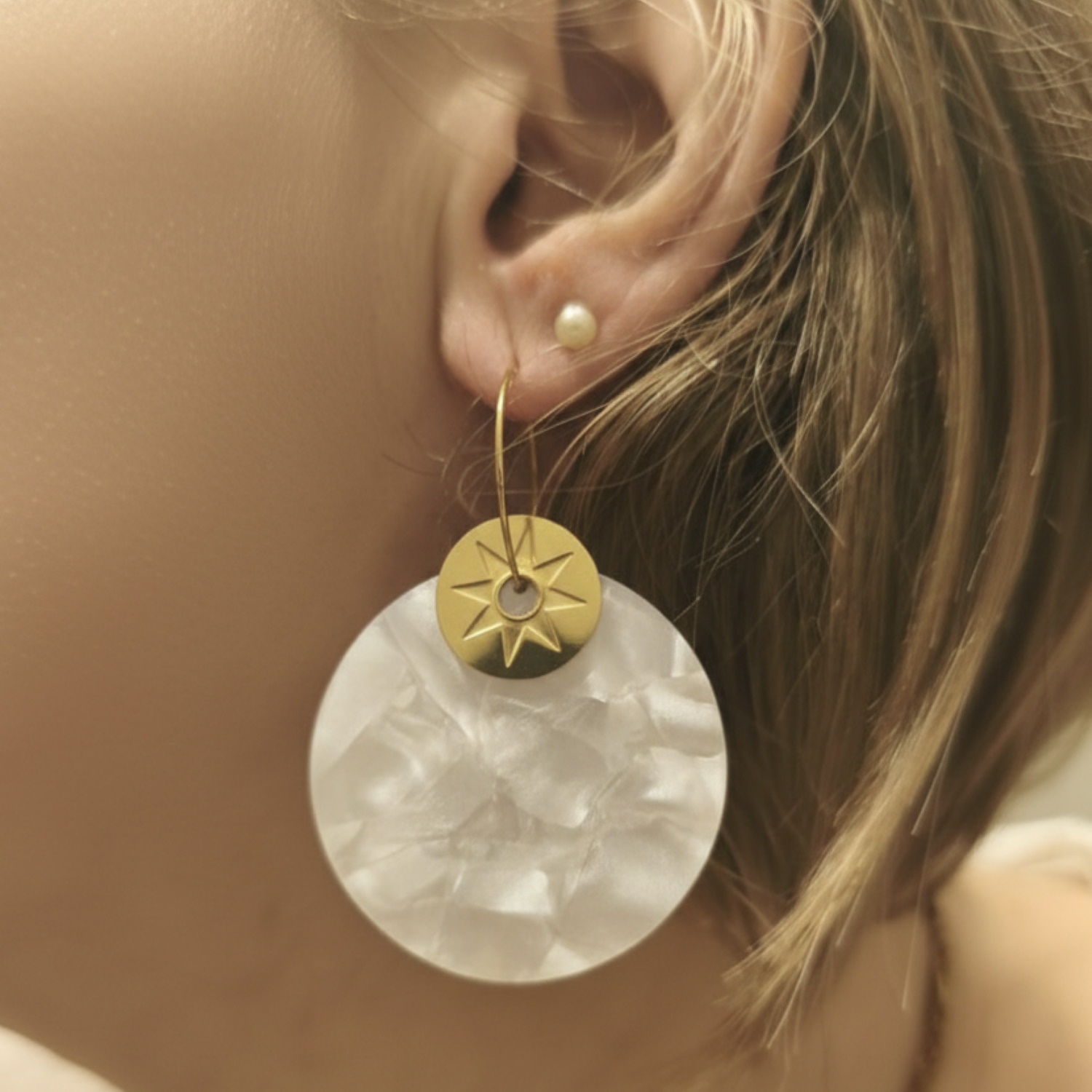 Description Boucles d'oreilles créoles avec une pastille ronde ajourée d'une étoile en acier doré et avec une pastille de couleur blanche. Largeur 40 mm Hauteur 57 mm Diamètre 20 mm Matière(s) Acier , Plastique . L'acier utilisé dans la bijouterie existe sous plusieurs qualités. Nous utilisons principalement la qualité 316L, qualité qui est utilisée en chirurgie. Cet acier est donc inoxydable et reste très résistant. Fermoir Autre Couleur(s) dominante(s) Blanc , Doré Public Adolescent , Adulte . Genre Femme , Fille . Saison Indémodable . Thème(s) Nature . Cliquez sur une matière, un thème, une couleur ou une collection pour voir tous les articles associés.