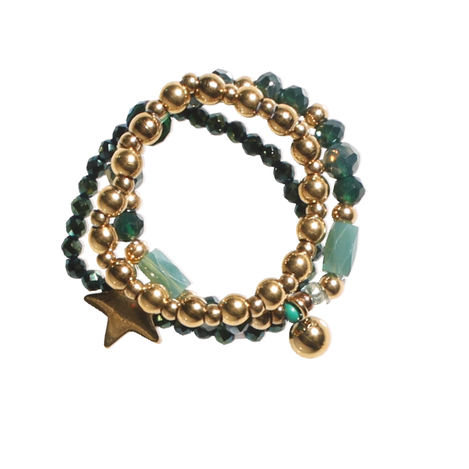 Description Lot de 3 bagues élastiques composées de perles en acier doré, de perles de couleur verte et d'une étoile en acier doré. Largeur 8 mm Matière(s) Acier , Rocaille . L'acier utilisé dans la bijouterie existe sous plusieurs qualités. Nous utilisons principalement la qualité 316L, qualité qui est utilisée en chirurgie. Cet acier est donc inoxydable et reste très résistant. Couleur(s) dominante(s) Doré , Vert Public Adolescent , Adulte . Genre Femme , Fille . Saison Indémodable . Thème(s) Nature . Cliquez sur une matière, un thème, une couleur ou une collection pour voir tous les articles associés.