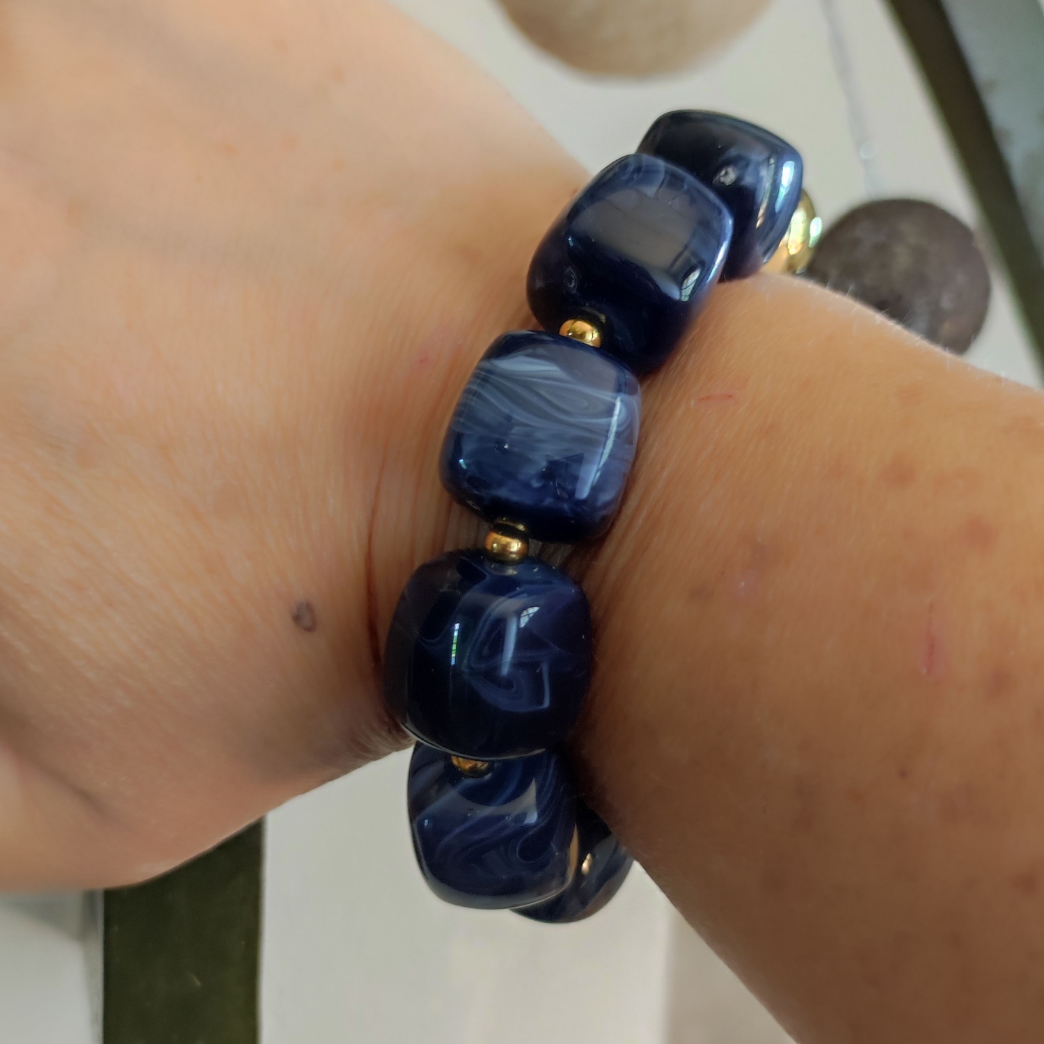 Description Bracelet élastique composé de perles en acier doré et de pierres bleues de forme cubique. Longueur 18 cm [Guide des tailles] Largeur 16 mm Matière(s) Acier , Rocaille . L'acier utilisé dans la bijouterie existe sous plusieurs qualités. Nous utilisons principalement la qualité 316L, qualité qui est utilisée en chirurgie. Cet acier est donc inoxydable et reste très résistant. Fermoir Aucun Couleur(s) dominante(s) Bleu , Doré Public Adolescent , Adulte . Genre Femme , Fille . Saison Indémodable . Cliquez sur une matière, un thème, une couleur ou une collection pour voir tous les articles associés.