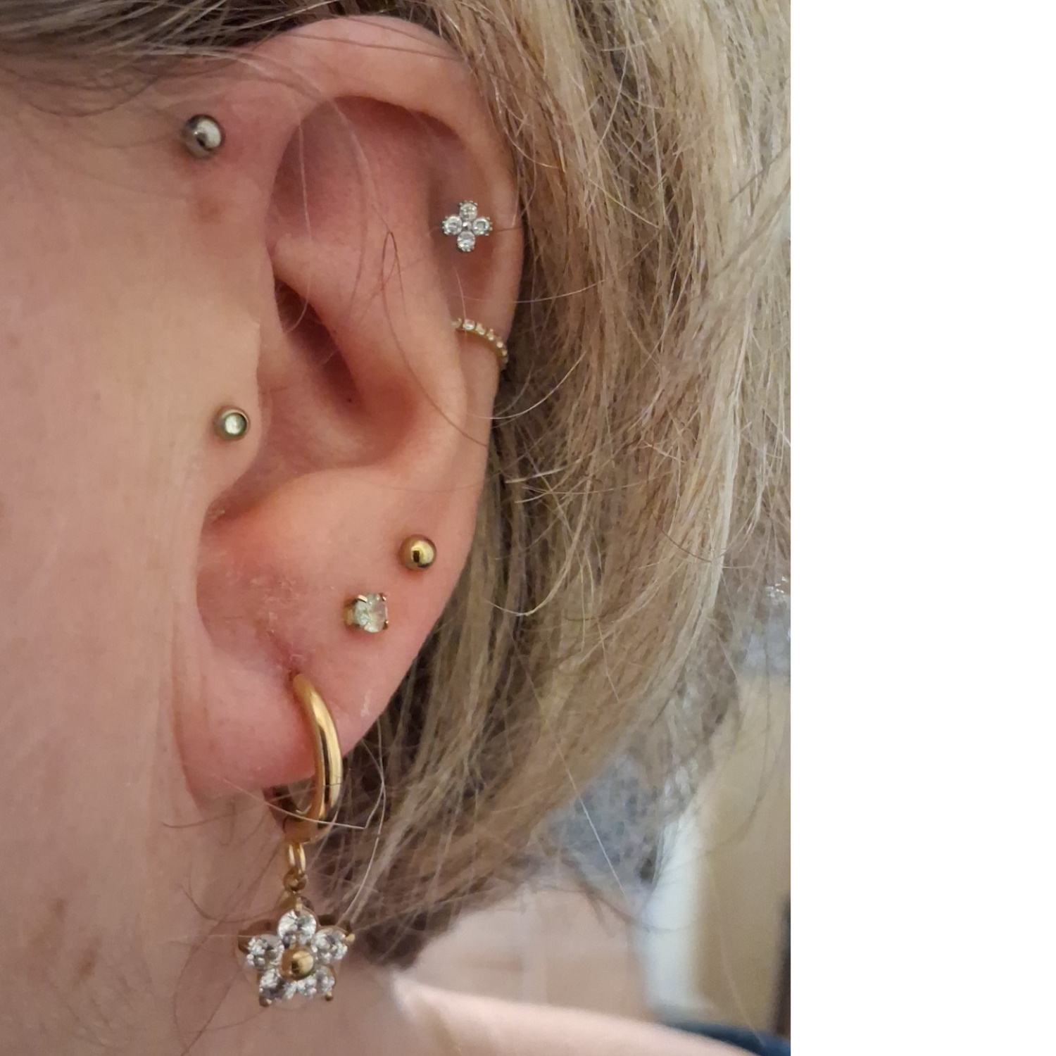 Boucles d'oreilles créoles en acier chirurgical 316L doré avec un pendant en forme de fleur sertie d'oxydes de zirconium blancs.