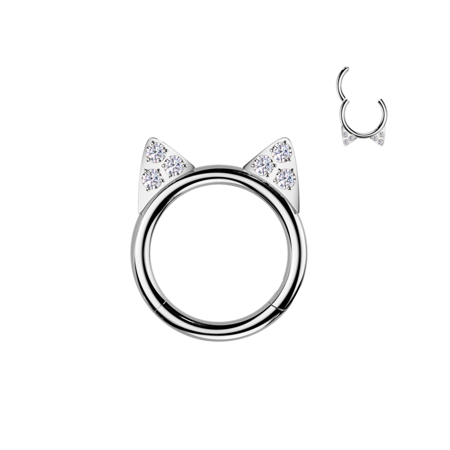 DescriptionPiercing anneau en titane argenté de qualité implantaire avec des oreilles de chat pavées d'oxydes de zirconium blancs.Cliquez sur une matière, un thème, une couleur ou une collection pour voir tous les articles associés.