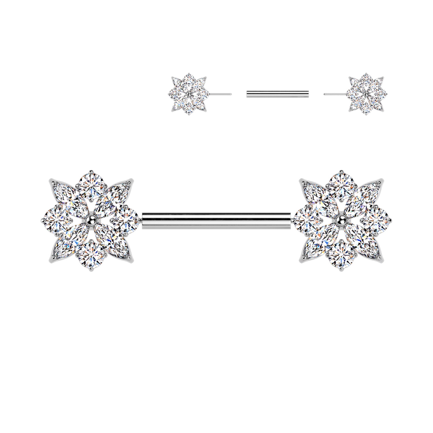 Description Piercing pour téton/mamelon en acier chirurgical 316L argenté avec deux fleurs serties d'oxydes de zirconium blancs. Cliquez sur une matière, un thème, une couleur ou une collection pour voir tous les articles associés.