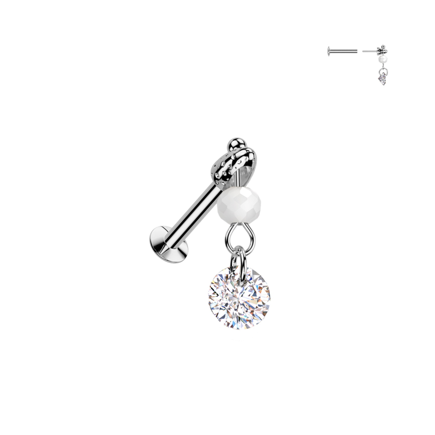 Description Piercing en acier chirurgical 316L argenté avec des pendants composés d'une perle blanche et d'un oxyde de zirconium blanc. Cliquez sur une matière, un thème, une couleur ou une collection pour voir tous les articles associés.